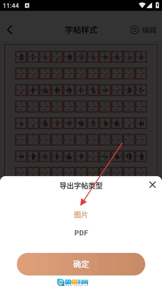在导出字帖的类型选择框里,选中【图片】这一选项,接着点击【确定】按钮,就能把字帖导出为图片格式了。