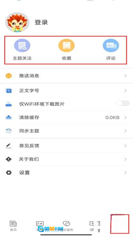 3、点击底部导航栏中的“我”图标,进入个人中心页面,在这里可以查看主题关注、收藏、评论等各个功能模块的内容。