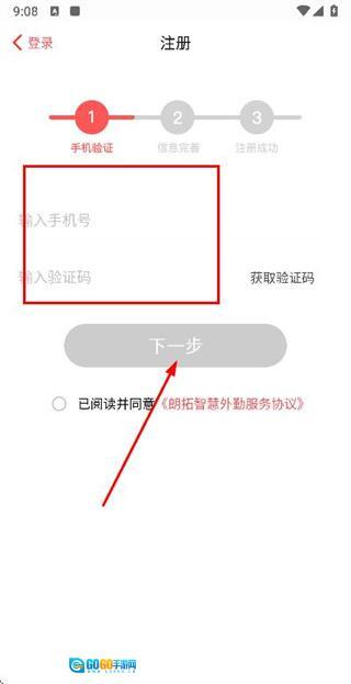 2、在注册流程的手机验证环节,填写对应的手机号和收到的验证码,勾选相关协议后点击“下一步”按钮,即可进入信息完善页面。