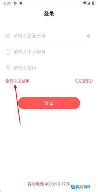 1、在登录界面点击“免费注册试用”按钮,跳转至注册流程中的手机验证页面。