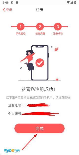 4、在注册成功页面点击完成按钮,即可结束整个注册流程。