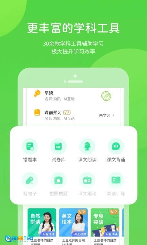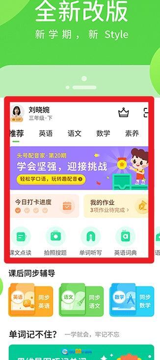 进入首页后,能查看学习进度和作业情况,同时支持课文点读、拍照搜题、单词听写、英语语音等多种学习功能。