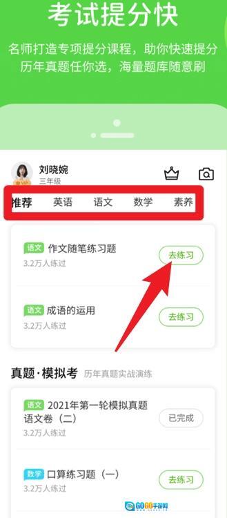 在学习课程页面,你可以选择推荐、英语、语文、数学、素养等不同模块,进入相应板块后就能开展专项练习和模拟考试。