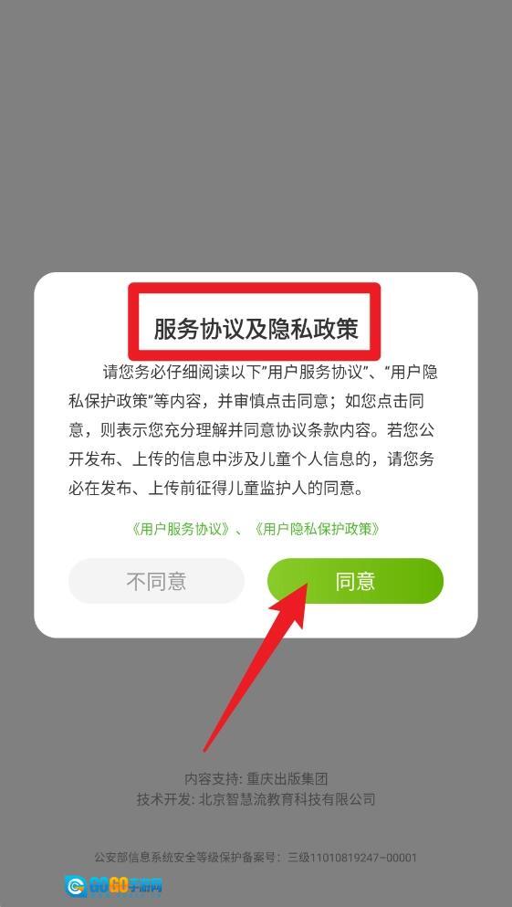 1、首次打开冀教学习应用时,会弹出【服务协议及隐私政策】提示框,请仔细阅读相关内容后点击【同意】按钮,这样就能继续使用该应用了。