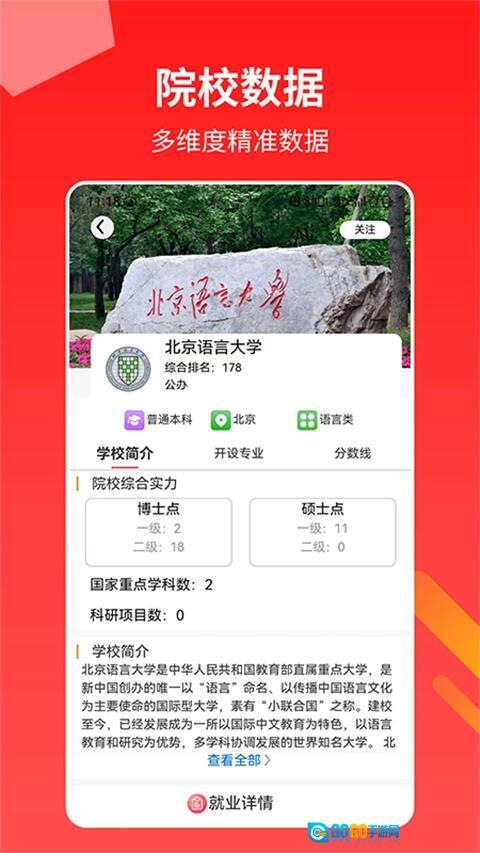 “院校搜索”功能涵盖全国1000余所院校的详尽资料,具体包含过往录取分数线、招生规划、开设专业、就业前景、学费标准、建校时间、重点学科设置、附属单位、院校类别、办学规模以及博士点数量等内容。