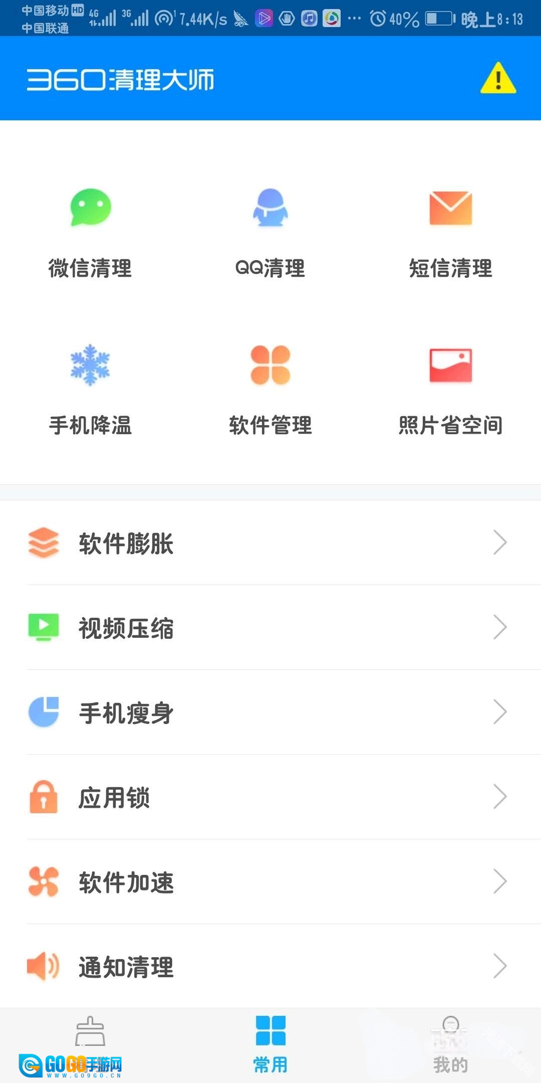 点击“常用”按钮后,在弹出的界面中,你会看到QQ清理、微信清理、短信清理、手机降温、软件管理以及照片省空间等功能选项。