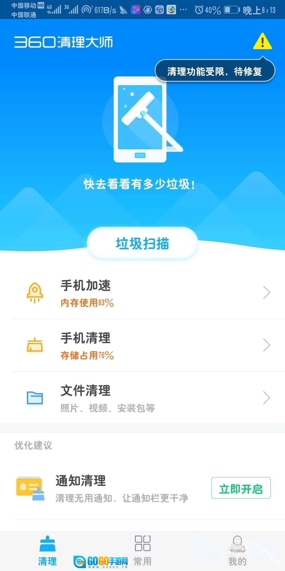 在“优化建议”板块中设有两个功能选项,其一为通知清理,该功能能够协助您移除手机中无用的通知信息;其二是自动清理垃圾,此功能可自动对手机内的各类垃圾文件进行清除操作。