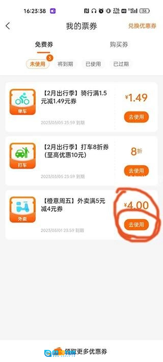 3、优惠券界面中有多种可领取的优惠券,包括外卖券、美食券等,都能免费领取。