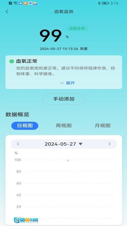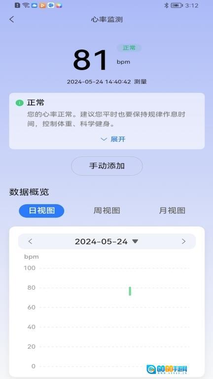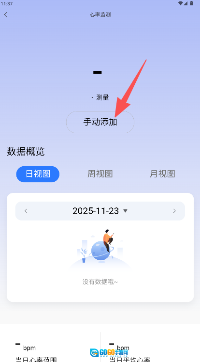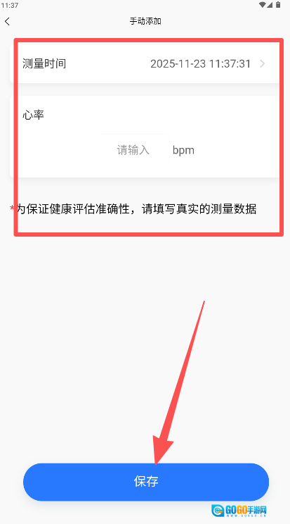 3、进入手动添加页面后输入心率数值,最后点击“保存”按钮即可完成记录。