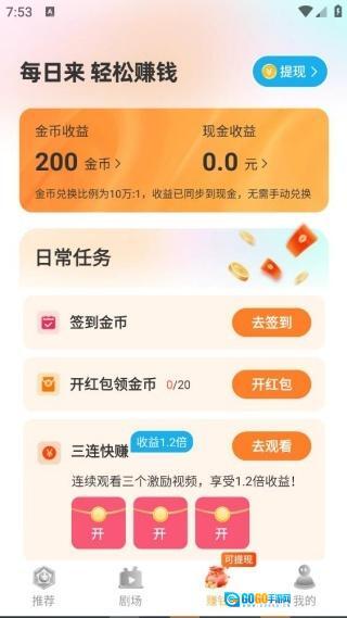 1、安装完成后打开软件,就能开启一边看剧一边赚收益的模式了。