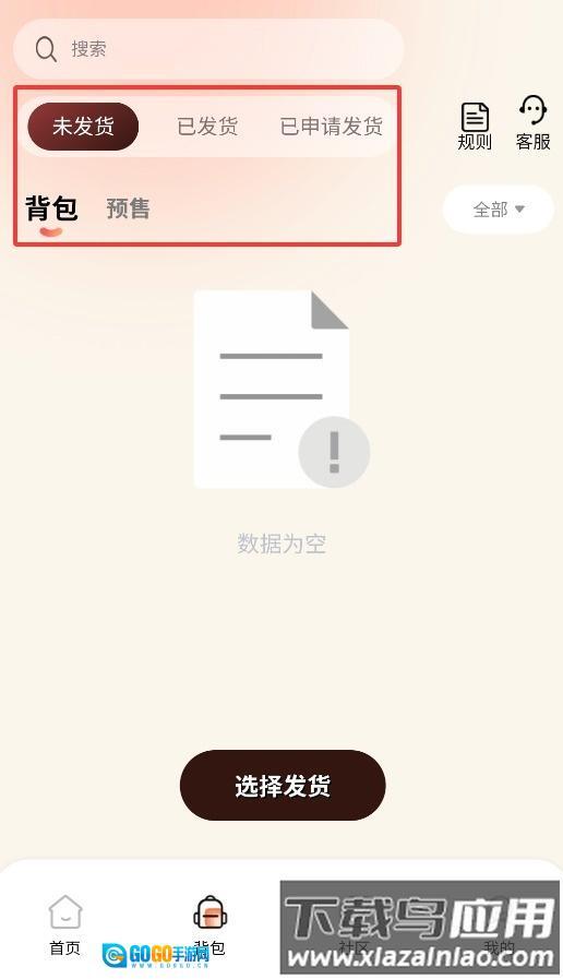 3、借助“背包”功能能够查看商品的状态,其中涵盖了未发货、已发货以及已申请发货的订单。