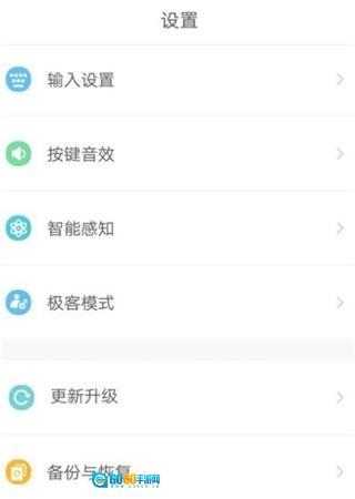 接下来,你可以进入设置选项卡页面。在这个页面中,你能够对输入设置、按键音效、智能感知、极客模式进行配置,也可以完成备份与恢复的相关设置,还能进行应用程序的更新操作。