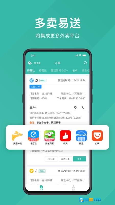 支持多家外卖平台订单,涵盖口碑、有赞、京东到家等多个平台;