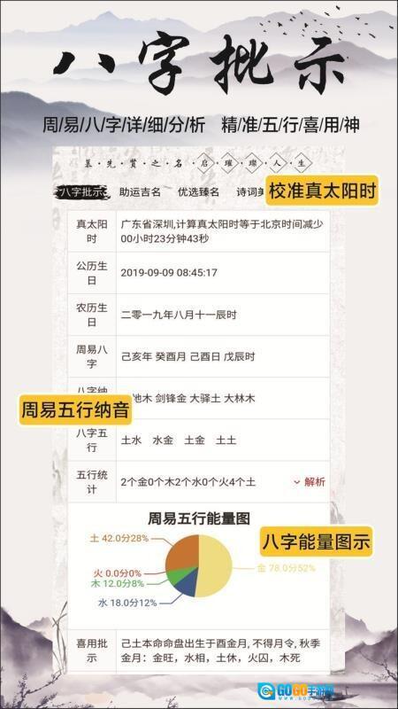 2.测名解名功能:从八字喜用神匹配、文化内涵典故溯源、姓名学三才数理评分等多个维度展开姓名测评,帮助用户更深入、全面地洞悉名字所蕴含的深层意义。