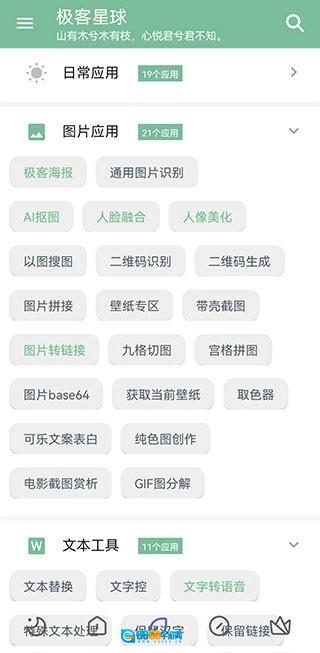 极客星球是一款界面清爽且功能丰富的安卓工具箱应用,涵盖资源获取、实用工具、信息浏览等多元服务板块。用户既能通过它获取电影动漫、小说游戏等各类资源,也能借助工具箱功能解决生活中的各种实际问题,同时它还是一个便捷的知识学习与资源阅读平台,感兴趣的朋友不妨来亲自体验一番!