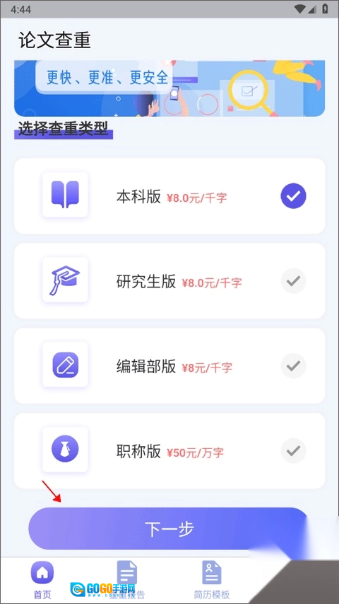 打开论文查重助手软件并进入【首页】,页面上呈现出多种查重类型,包括本科版、研究生版、编辑部版、职称版等,用户可依据自身需求选择对应的版本,随后进入下一步操作。