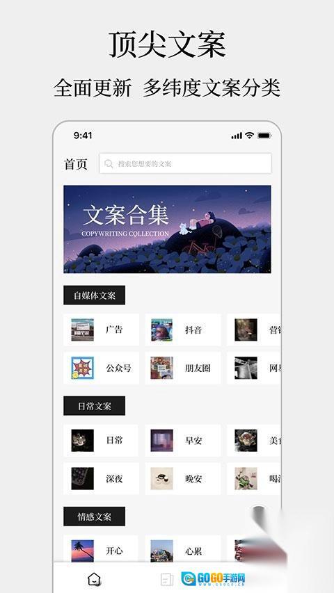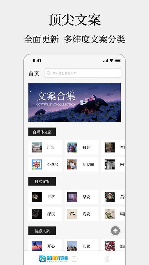 顶尖文案是一款覆盖海量类目的优质文案库软件,适用场景十分广泛。用户能依据自身需求,获取各类名言美句用于摘录或参考,从而让文案创作变得更轻松,既能领略优美的语言艺术,也能学会优雅地表达。