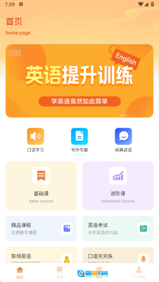 首页设有口语学习、写作专题、经典谚语、基础课、进阶课、精品课程、英语考试、职场英语及口语天天练等多个模块。