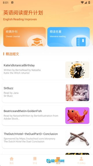 4、阅读页面涵盖经典外刊、精读名著以及各类精选短文内容。