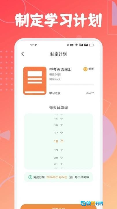 2、支持依据自身基础定制专属单词学习计划,能够设定每日的背诵量,完成学习任务后还可以通过打卡来记录学习进度。