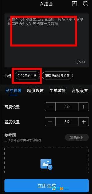 点击“开启AI创作之旅”按钮后,系统会提示您输入描述性文本,比如“2100年的世界”这样的内容。