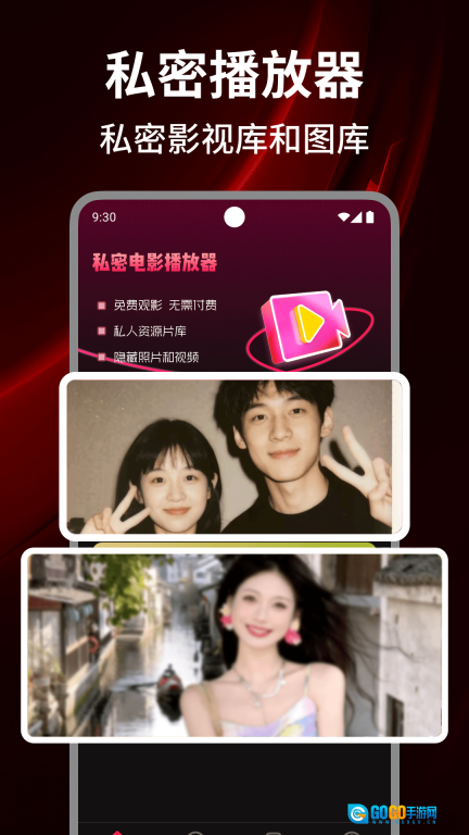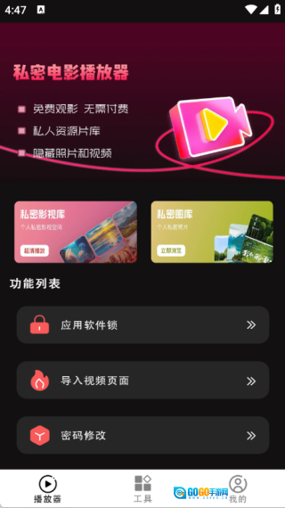 1、播放器页面支持私密影视库与私密图库的体验,还具备应用软件锁、视频导入页面以及密码修改的功能。