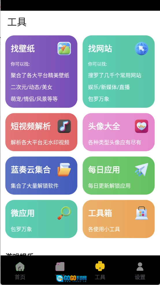 进入“工具”页面后,能看到不少工具,像短视频解析、表情包、壁纸之类的都在其中。