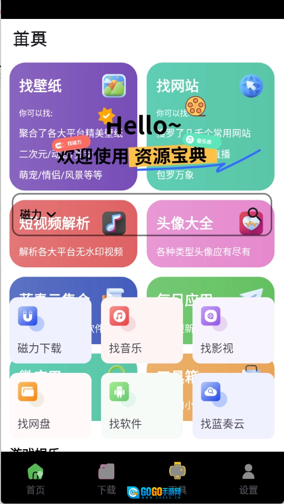 资源宝典是一款超级全面的资源查找神器,能搜索影视、音乐,还能使用各类小工具,全程弹窗,所有资源均免费提供。它有着详细的分类,可满足用户日常生活、工作与学习的需求;资源会持续更新,确保用户随时能获取最新资源,用户想找的各类资源基本都能在这里找到。