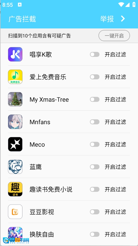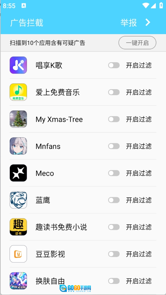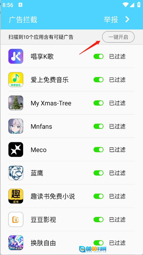 开启过滤广告功能即可,也可以选择一键开启。