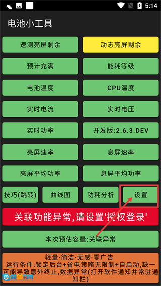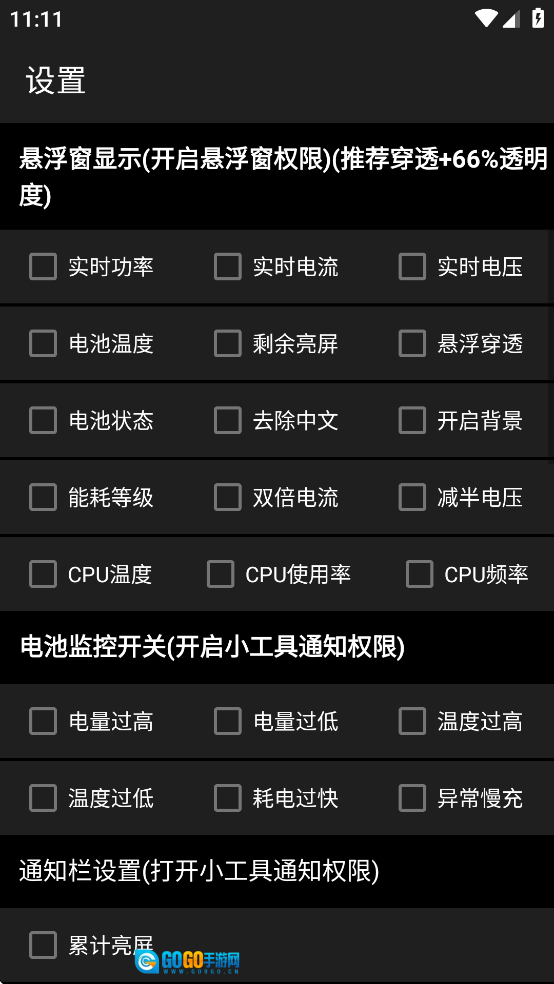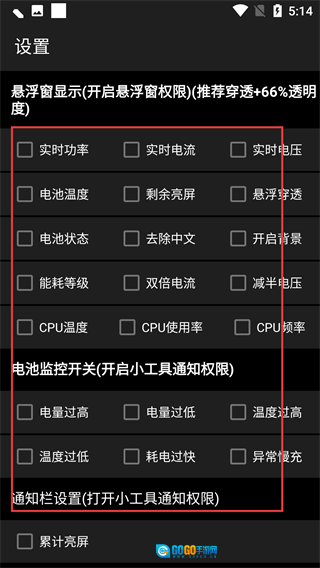 1、打开设置界面后,首先要处理【悬浮窗显示-开启悬浮窗权限】这一项,你可以勾选【实时功率】【实时电流】之类的选项,以此来配置电池监控开关的相关权限。
