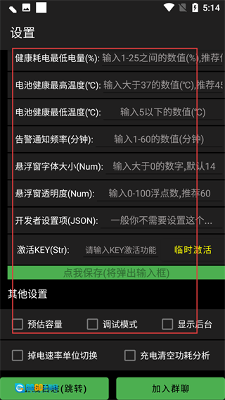 在设置界面中,能够对【健康电池最低电压-(%)】【电池健康最高温度-(℃)】这类参数进行设置,还可以调整【悬浮窗字体大小-(Num)】。
