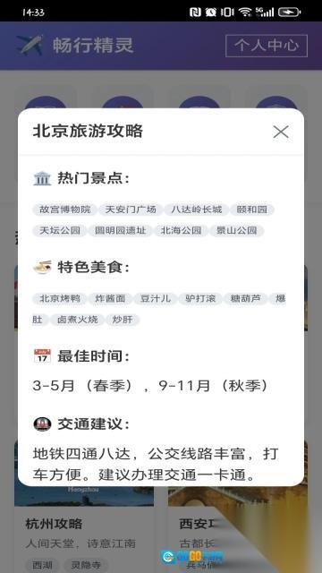 2、通过北京旅游攻略页面,能够知晓热门景点、特色美食、最佳出行时间以及交通方面的建议等信息。