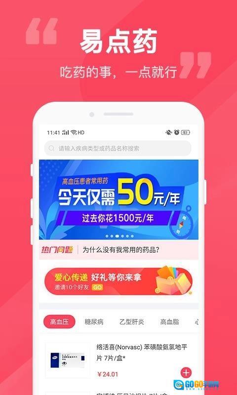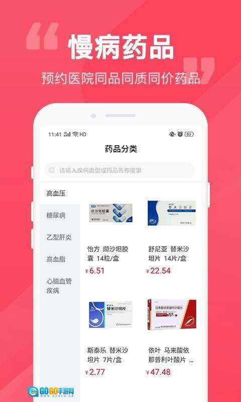 精选品类:聚焦于高血压、高血脂、乙肝、糖尿病等慢病领域,为用户提供常用药品。