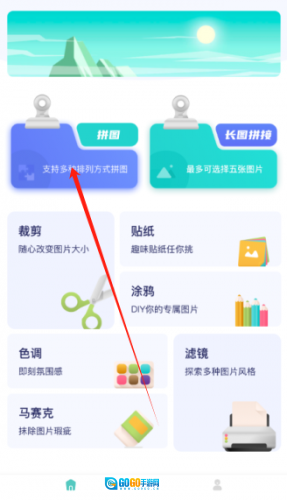 2、进入首页选择拼图的模式,可以选择拼图也可以选择长图拼接,看个人需要,小编使用的排列拼图;