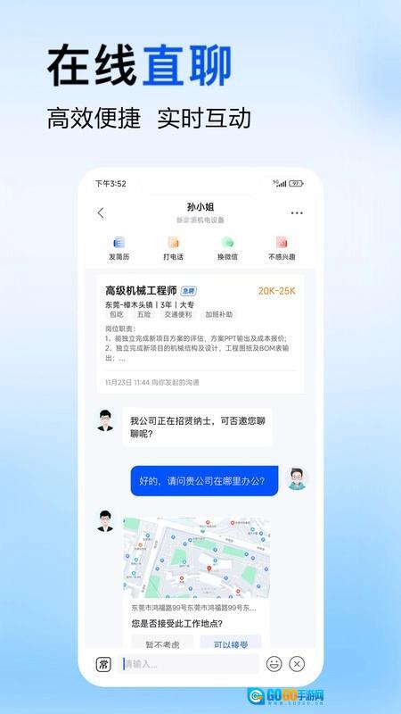 【在线沟通,即时畅聊】直接与你的老板或HR在线交流。要是你们聊得投机,就可以去面试啦。这既实用又让人安心!