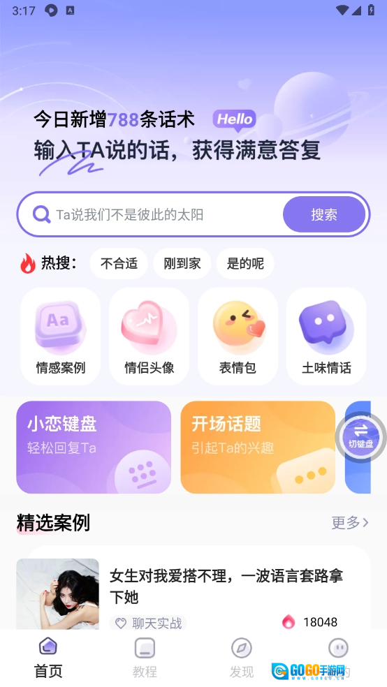 拥有40万+聊天技巧与话术,只需搜索对方的话语,即可找到完美回应,轻松应对聊天难题。