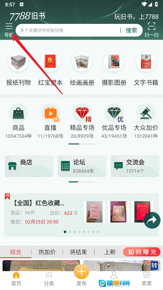 首页设有多个旧书相关板块,点击左上角的“导航”按钮即可查看。