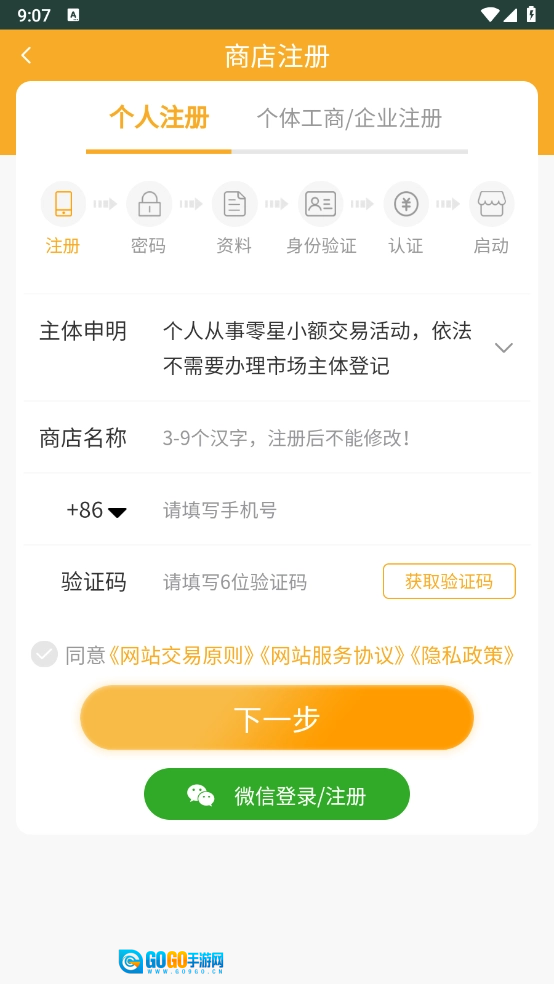 先选择个人或商户身份,接着选择主体申明选项,输入商店名称、手机号码和验证码,之后点击下一步并按照页面提示完成后续操作,就能成功开设店铺了。