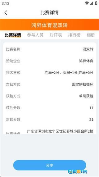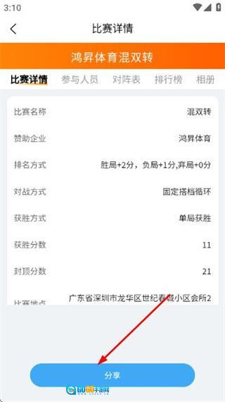 3、进入比赛详情页面后,点击分享按钮,即可完成该赛事的分享。