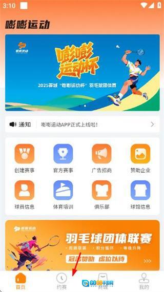 1、在嘭嘭运动首页点击底部的约赛,进入约赛页面。