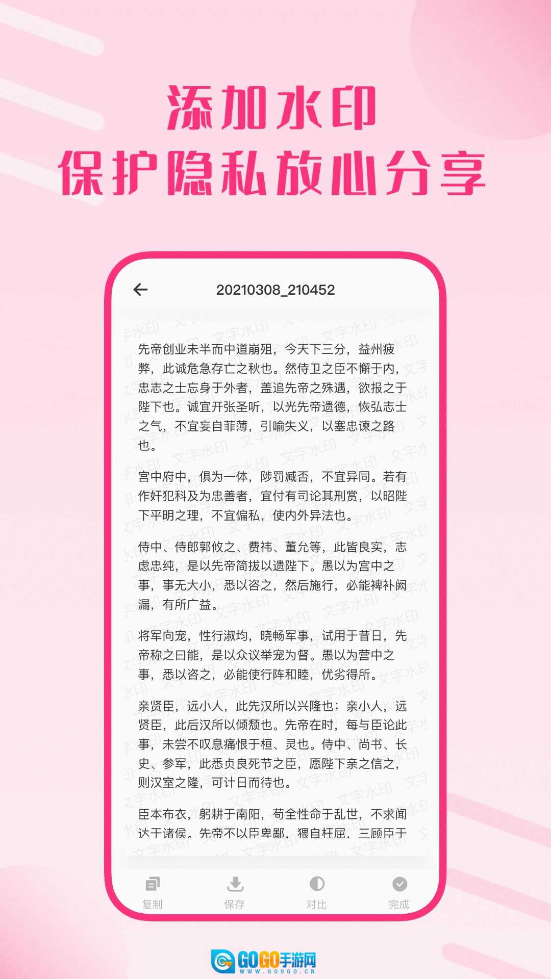 可以导入相册里的图像或照片,既能添加单个水印,也能设置全屏水印,还能创建具有防伪功能的自定义水印。