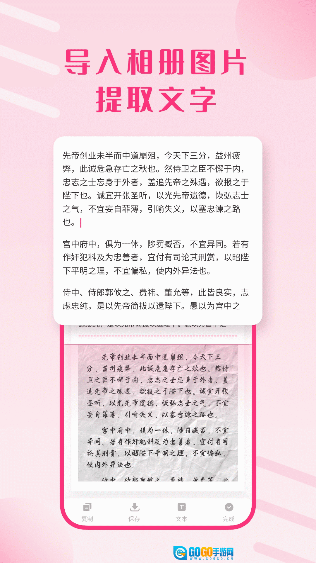 这款软件借助先进的图像识别技术,能把图像中的文字内容转化为可编辑的文本形式,支持用户自由进行复制、导出等操作。