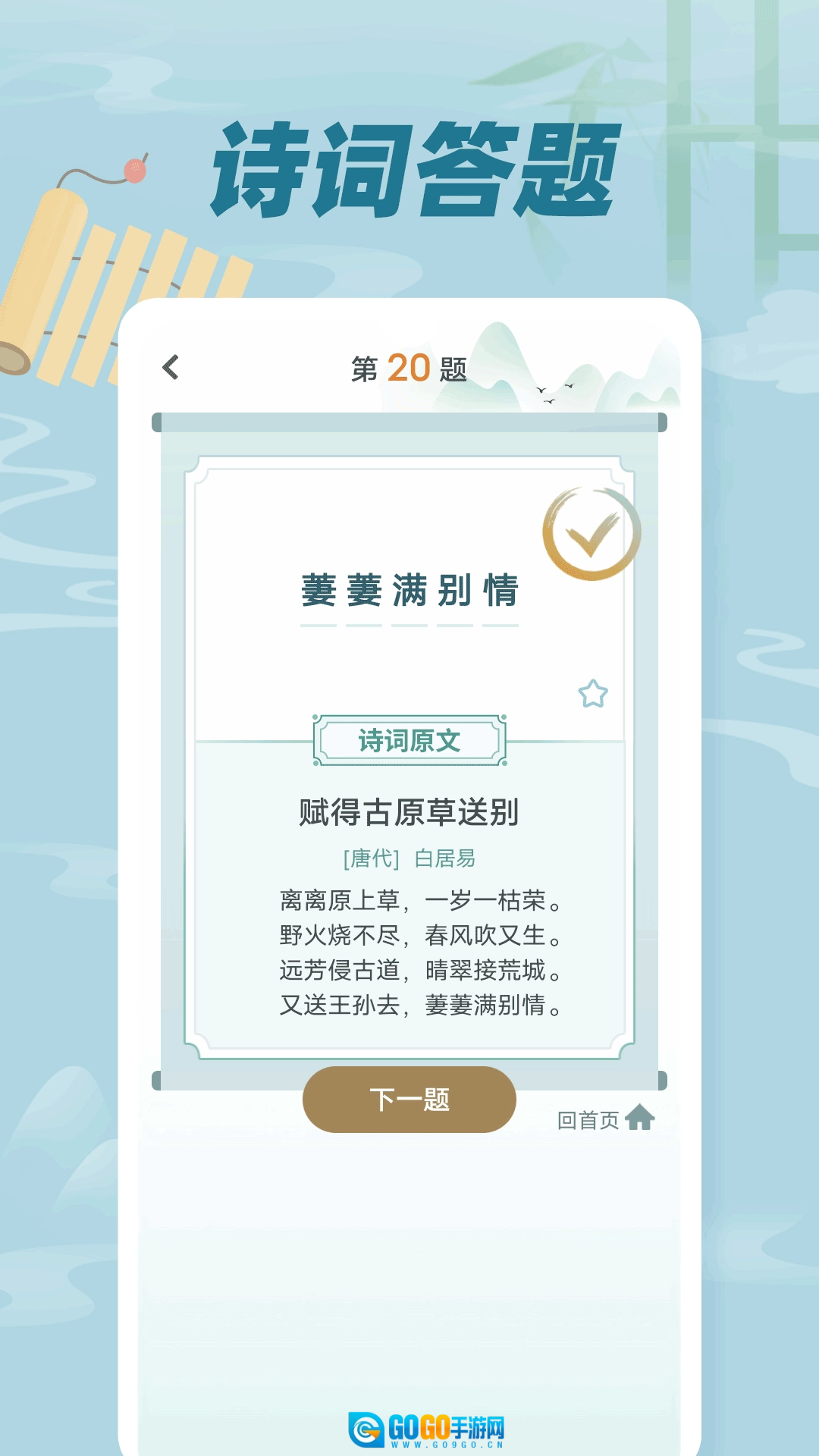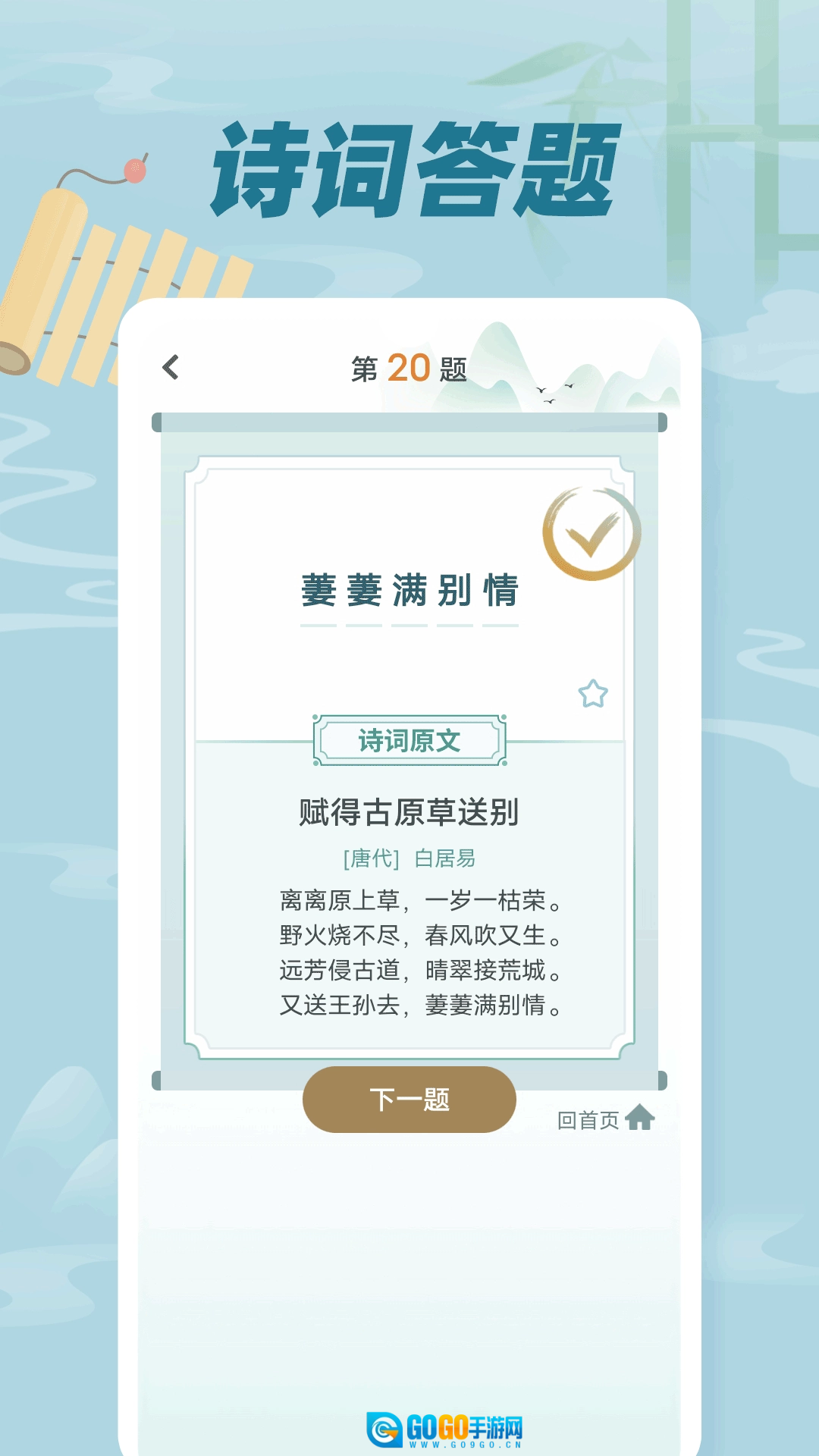 《古诗词文》这款软件对每首诗都做了分类,用户可以按照风格进行搜索,借助它学习古诗十分便捷。软件里的每首古诗都配有相应解析,能帮助用户深入了解诗词内涵,进而学习更多中国文化。此外,软件还设置了一些题目供用户完成,以此检验大家的诗词积累量。
