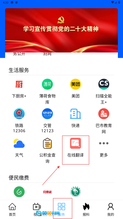 3、在服务页面中,点击【在线翻译】功能按钮,即可进入翻译工具页面。