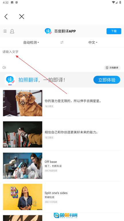 4、在翻译页面的【请输入文字-输入框】中填写需要翻译的内容,然后执行翻译操作。