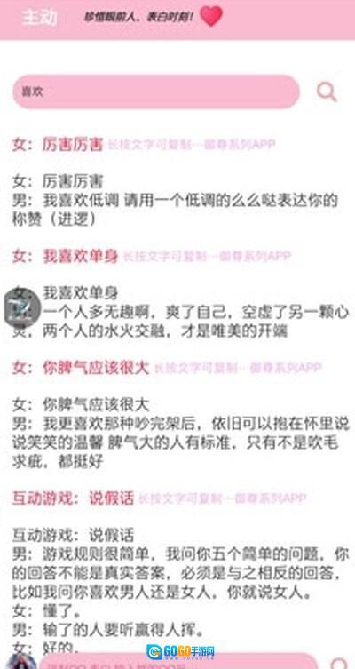 1.恋爱话术储备充足:这款恋爱话术搜索软件收录了海量的恋爱话术内容,覆盖了初次见面、深入沟通、情感维系等各类恋爱场景与话题。
