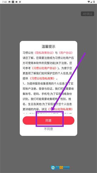 1、仔细阅读【习惯公社】的《隐私政策协议》和《用户协议》提示内容后,点击【同意】按钮,以此确认接受相关协议并进入后续操作流程。