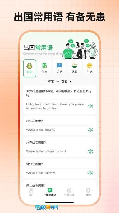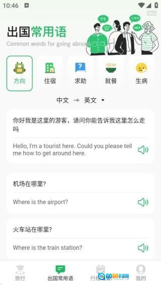 3、提供出国常用语服务,覆盖各类不同场景,支持中英文互译,还具备语音播放功能,助力出国交流从容应对。