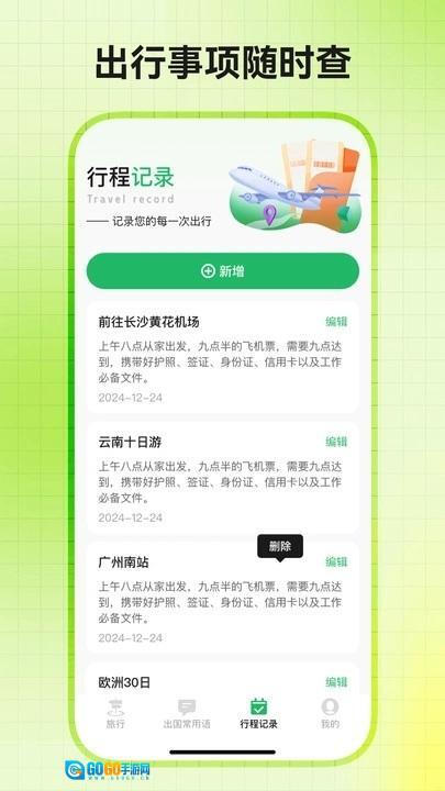2、拥有行程记录功能,可随时添加、修改、删除行程,记录出行的时间、地点、需携带的文件等相关信息。