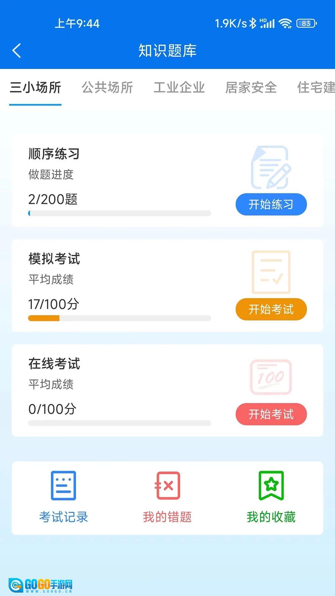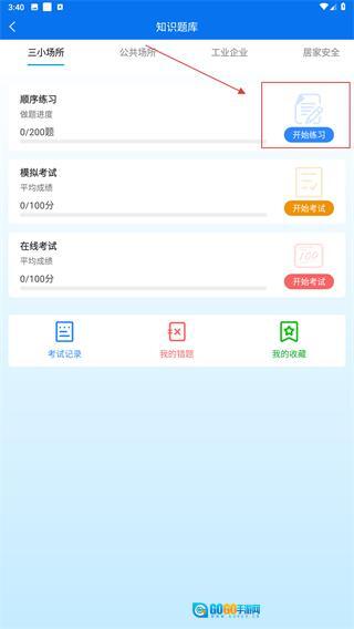 2、在【知识题库-三小场所】页面中,点击【开始练习】按钮,即可进入顺序练习题目的作答流程。